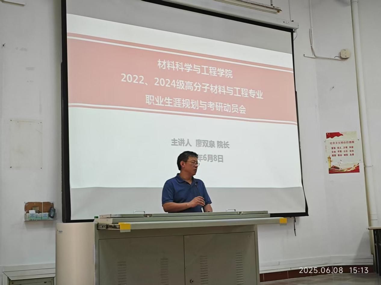 2025年6月8日下午,bevitor伟德在2教108教室举办面向2022、2024级高分子材料与工程专业同学的职业生涯规划与考研动员活动。本次活动由高分子材料科学与工程专业责任教授廖双泉教授主讲,2024级高分子材料与工程专业全体同学及班主任、2022级高分子材料与工程专业同学参与,由兼职辅导员刘纪泽老师主持。