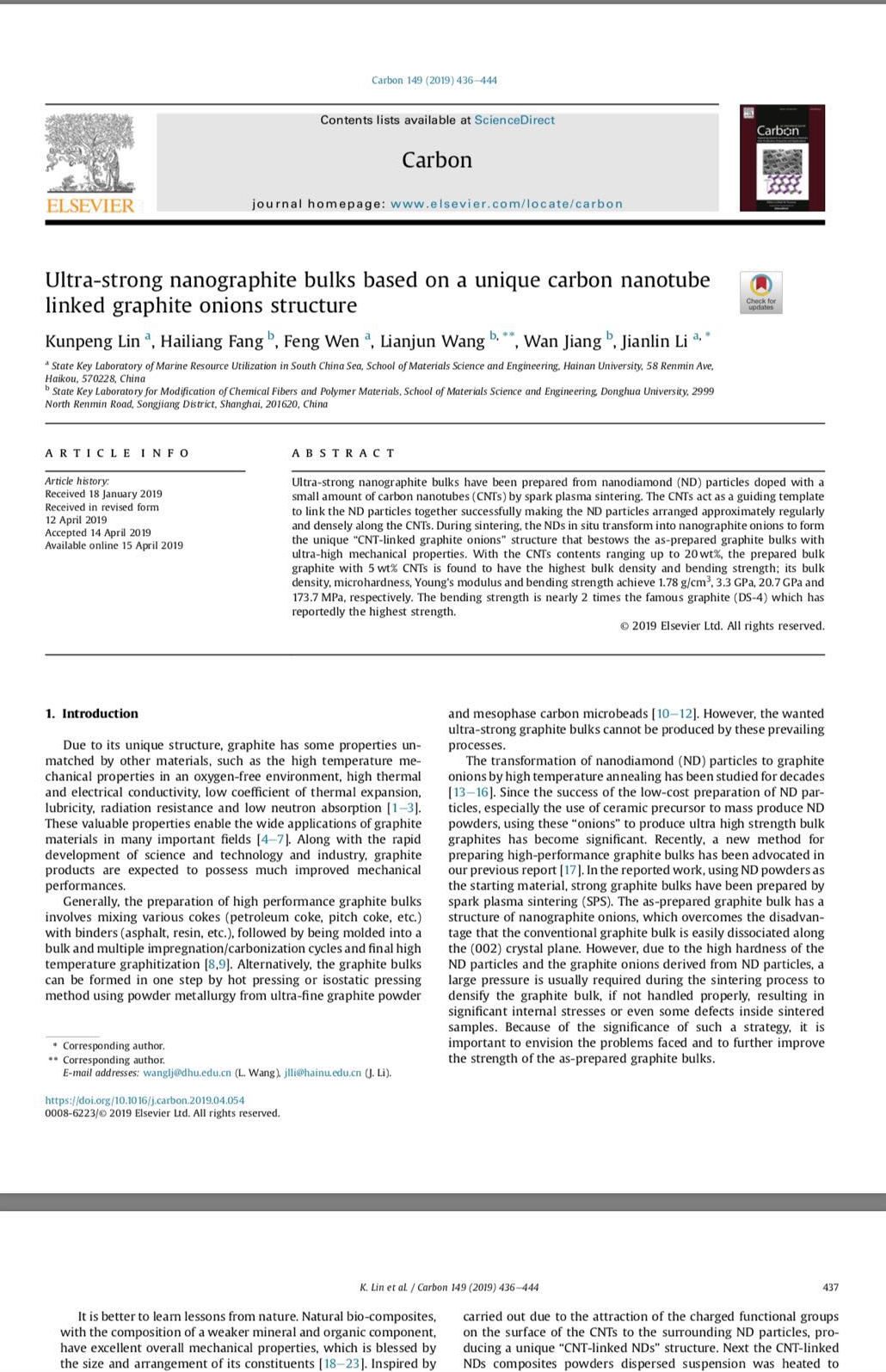 近日,bevitor伟德李建林教授、文峰教授科研团队在高性能石墨材料研究中取得重要进展。 这项工作的部分研究成果发表在碳结构材料的国际顶级期刊Carbon (Ultra-strong nanographite bulks based on a unique carbon nanotube linked graphite onions structure, 2019, 149, 436-444)。 在前期的研究工作基础上,研究人员通过仿生设计,在纳米金刚石粉体中引入少量碳纳米管,巧妙地解决了金刚石粉体转化制备石墨块体内部残余应力较大的难题。所制备的石墨块体为纯石墨相,其抗弯强度达到目前最强石墨材料的2倍,这一工作有望突破石墨材料的高精度加工的技术瓶颈。目前正在和有关单位合作,开发某些领域的专用石墨元器件。 2016级硕士研究生林坤鹏为论文第一作者。这项工作是与东华大学的相关课题组合作共同完成。(文/图:李建林)