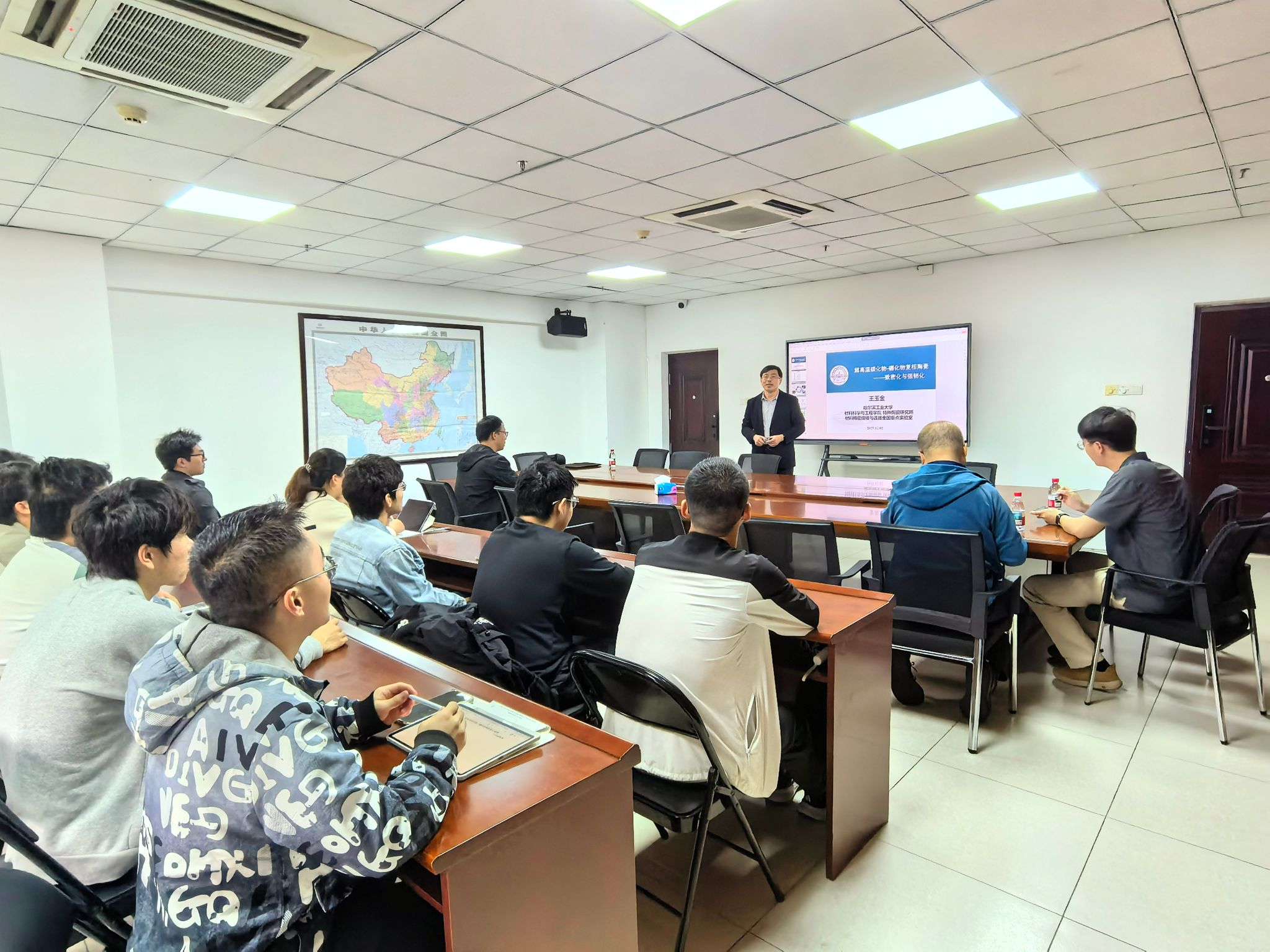 报告中,王玉金教授系统阐述了碳化物-硼化物陶瓷复合材料在航天、航空、超高速飞行器及发动机热端部件等高科技领域的重要应用前景,介绍了通过微观结构设计与界面调控,兼顾材料高温性能与力学韧性的研究思路,分享了其在解决基体与增韧相容性、尺寸控制及烧结致密化等关键难题方面的研究进展,为超高温陶瓷复合材料在极端环境下的可靠应用提供了重要支撑。同时,王玉金教授还结合自身经历,围绕国家自然科学基金申报进行了交流与分享,为与会教师提供了宝贵的科研项目申报经验。