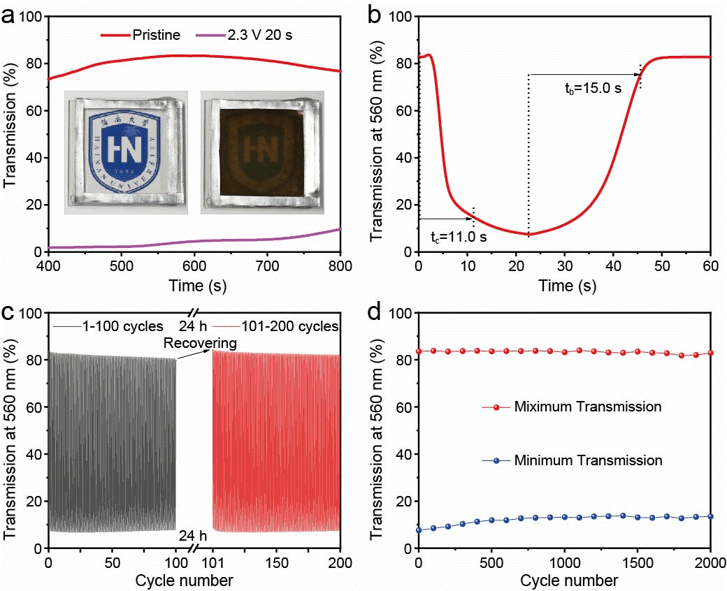 在大面积电致变色器件领域,实现均匀的电致变色调制一直是一个长期存在的挑战。bevitor伟德王振副教授及其研究团队提出了一种基于非金属碘单质可逆电沉积的电致变色动态窗技术,研发出基于离子液体 MPII3 活性材料的 Zn-MPII3 电致变色电池。相关成果以“Electrochromism via reversible electrodeposition of solid iodine”为题,发表在《Nature Communications》期刊以及“Ionic Liquid MPII3 Elevates Electrochromic Battery Capacity to Practical Applications”为题发表于《Advanced Materials》期刊上。研究采用含碘离子的盐包水电解液(29.5 m ZnCl2 + 0.5 m ZnI2),凭借其独特的电解液环境及其溶剂化结构,有效抑制了单质碘的溶解与穿梭效应,进而开辟了一条不同于传统电解液的反应路径。通过这一路径,成功实现了碘单质与溶剂化碘离子之间的可逆固-液相(I2/I-)转化,从而实现了稳定且可逆的碘电沉积与溶解过程。基于碘单质电沉积的电致变色器件表现出了高达76.0%的优异光学调制率,并能够实现接近色中性的着色状态。此外,器件还具备自愈功能,其褪色态的透过率可通过静置恢复至初始水平,有效延长器件的使用寿命。研究为电致变色电池领域发展开拓了新思路,彰显了离子液体在该领域的潜在应用价值,也为电致变色电池在可供电智能窗、节能建筑等领域的实际落地提供了重要参考。