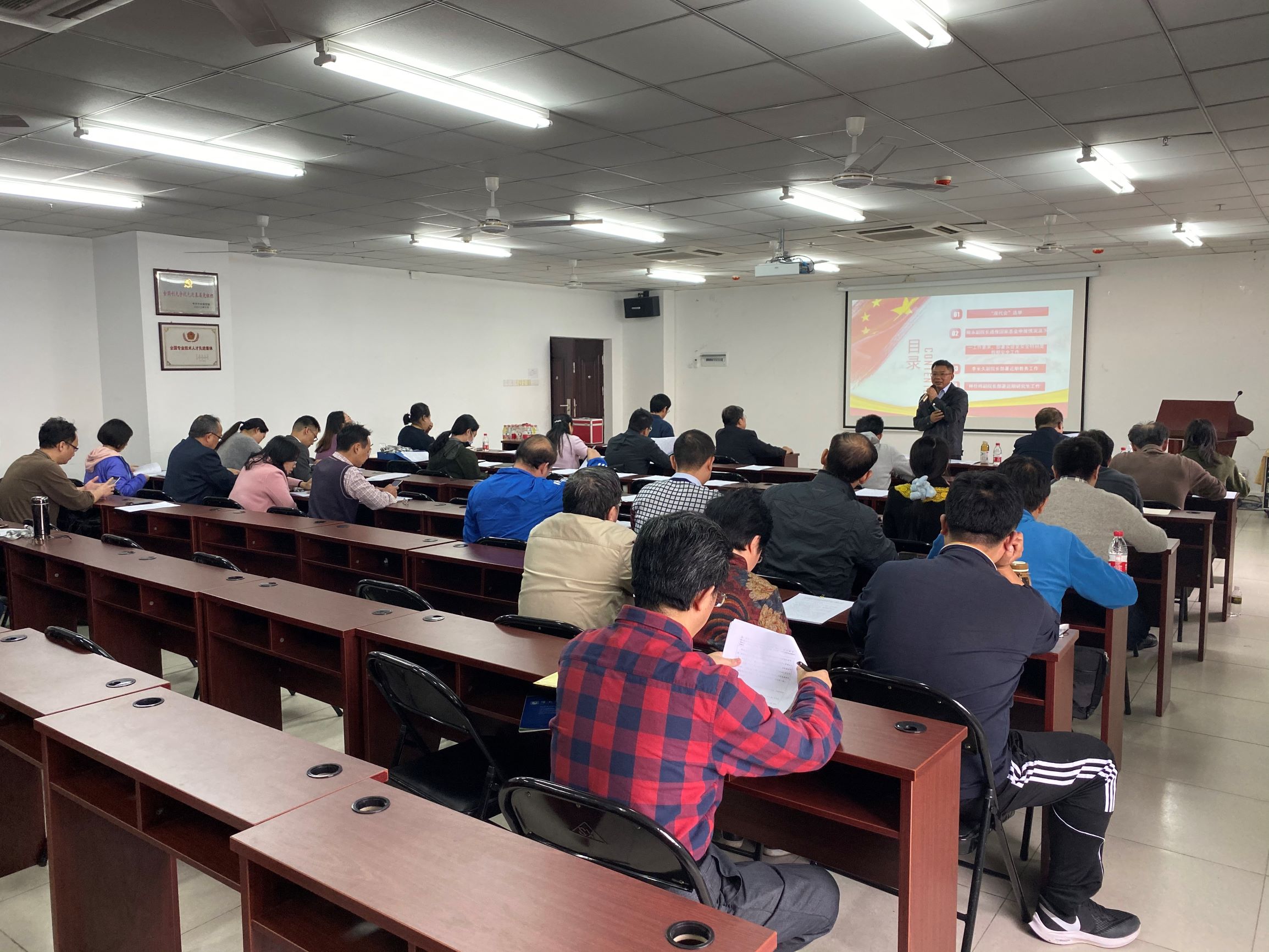 会议组织学习了十九届四中全会精神。习近平总书记在十九届四中全会上的重要讲话,为坚持和完善中国特色社会主义制度、推进国家治理体系和治理能力现代化提供了科学指南和基本遵循。全会通过的《决定》,深入回答了在我国国家制度和国家治理体系上“坚持和巩固什么、完善和发展什么”这个重大政治问题,集中了全党智慧,反映了人民意愿,是一篇马克思主义的纲领性文献,也是一篇马克思主义的政治宣言书。会议要求各教职员工要深入学习领会,推动学习贯彻工作走深走实。