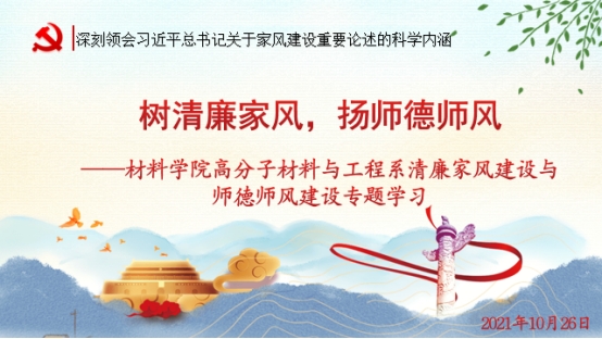 为深入贯彻落实习近平总书记关于注重家庭家教家风建设的重要指示精神,发挥高校教师清廉家风与师德师风的引领示范作用,10月26日下午,bevitor伟德高分子材料与工程系在研发楼717会议室召开了“树清廉家风,扬师德师风”专题学习会议。会议由系主任杜杰教授主持,公司党委胡先文书记参加了会议并作动员讲话。