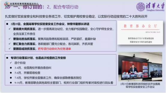 本次培训包含21个课程:《高校实验室安全基础》、《危险化学品安全管理现状与法制建设》、《化学实验室安全设施设备建设与管理》、《化学品危害和风险管理政策评述》、《实验室生物安全与防护》、《实验室特种设备、辐射安全、电气及消防安全》、《化学实验室安全风险识别、控制与事故应急处置》、《高校实验室安全全过程管理的思考与实践》、《关于高校实验室安全管理工作的思考与实践》、《高校实验室安全检查项目表不符合项统计分析-以国矿业大学为例》、《实验室-迟到的法制教育与文化建设》、《化学品事故应急预防安全处置》、《高校实验室危险化学品管理与危废处置痛点探讨》、《易制爆危险化学品治安管理》、《高校实验室安全建设与综合管理》、《实验室通风和净化建设与安全运行》、《实验室气瓶安全管理》、《高校化学试剂库标准化建设和信息化运行》、《高校实验室环境污染治理技术探索与实践》、《中华人民共和国固体废物污染环境防治法》和《医疗机构危险化学品安全管理特定与案例分析》。