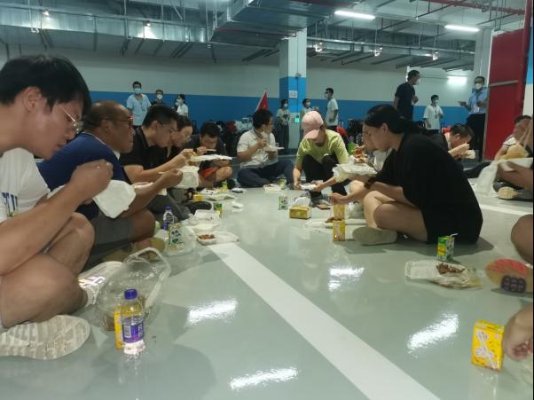 图二:支援陵水县抗击疫情青年志愿服务BEVITOR伟德志愿者工作后席地用餐,左一为虞培军。