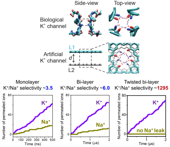 最近,公司bevitor伟德青年教师李继鹏博士,与北京航空航天大学郭维教授、清华大学卢滇楠教授、以及华南理工大学孔宪教授等合作,通过深入挖掘生物钾离子通道选择性滤器(selectivity filter)的精细结构,揭示出一个长期被忽视的特征(图),即生物孔道是利用具有空间螺旋结构的结合位点来实现特异性离子识别,这也是此前从未被仿生体系采用过的新特性。从这一原理出发,研究者创造性地在双层石墨烯埃孔上(angstrom-pore),用转角羰基环构造了仅有两个原子层厚的旋转结合位点,完全阻止了漏过非特异性的Na+(图),并且发现K+的传输遵从一种由层间水分子介导的双离子传输机制,并提出了下一代受电鳗启发的离子能转换的理论框架。