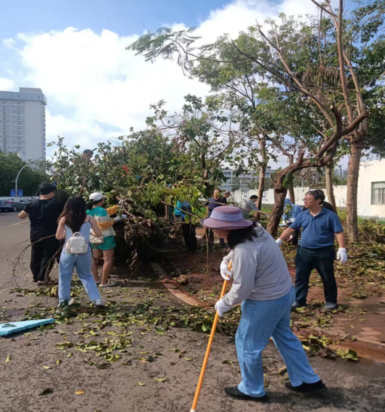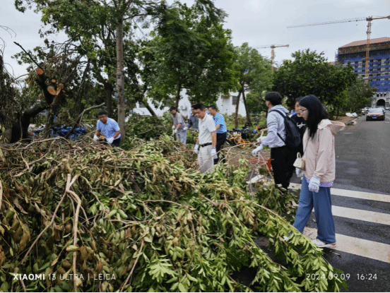 公司从9月8日到9月13日,在公司党委的组织领导下,先后组织5次志愿者活动,进行校园主干道清理工作。党员同志充分发挥先锋模范作用,迎难而上。公司教职员工积极参与,大家一同克服困难,齐心协力,对校园内的倒伏树木、积水与杂物进行了清理,出色完成了相应片区倒扶树木及垃圾的清理工作。