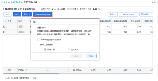 3.人员导入后,点击【预填专项附加扣除】按钮,根据采集的信息,按照规则自动完成表单预填。