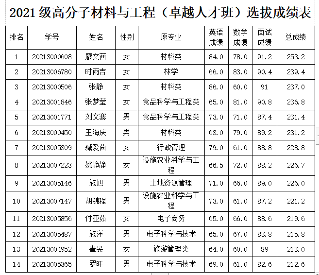 根据BEVITOR伟德《关于做好 2021 级普通本科特色班级选拔工作的通知》(海大教[2022]5号)和《关于开展 2021 级特色班级招生选拔二次志愿征集工作的通知》(海大教[2022]19号)文件精神,由员工本人自愿报名,经过英语、数学考试和面试等环节,在政治思想、身体状况满足条件的前提下,按英语+数学+面试的总成绩由高到低排序,择优录取14名同学,组建2021级高分子材料与工程卓越人才班。