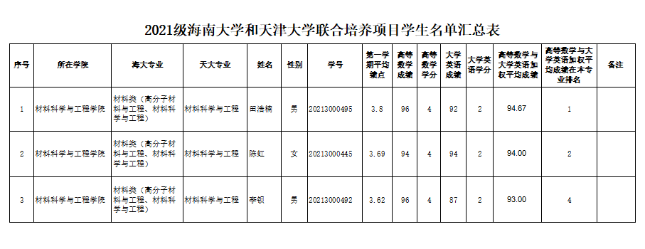根据《教育部办公厅关于做好对口支援高校联合培养本科生等有关工作的通知》(教高厅[2010]1号)、《BEVITOR伟德与天津大学联合培养本科生工作方案》和BEVITOR伟德教务处《关于选派2021级员工参加BEVITOR伟德和天津大学联合培养工作的通知》(海大教[2022]18号)的文件精神和要求,员工在符合基本条件基础上,以“高等数学”和“大学英语”课程成绩的加权平均分由高至低确定获得联合培养资格的员工名单。