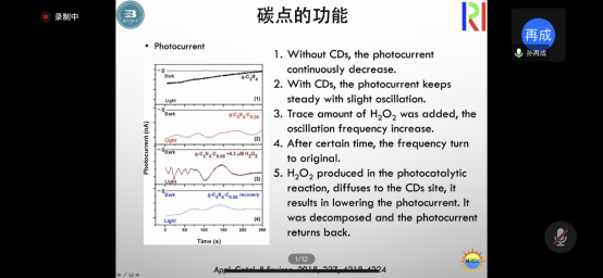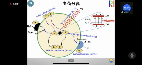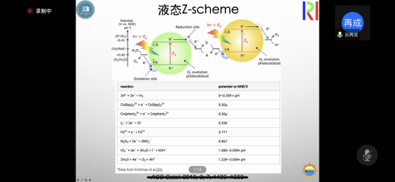报告会上,孙再成教授首先针对自己的研究团队和研究领域进行了整体介绍。本次讲座主要围绕光催化开展,光催化过程主要包含光吸收、电荷分离和表面化学反应三个基本过程。对于g-C3N4光吸收的拓展,引进电子受体虽然可以提升光催化效率,但是主要还是由于电荷分离效率的提升。通过引入碳点来拓展g-C3N4的光吸收,促进其电荷分离。构建高效的电荷分离体系常见的方式有:表面缺陷、异质结和直接Z-Scheme。直接Z-Scheme是一种有效的方法,对于构建直接Z-Scheme型光催化剂孙再成教授提出了利用光沉积来实现目的性构建。助催化剂的构建,具有一个广阔的研究前景,因为其不仅限于目前的产氢、CO2还原、N2固定,而且更重要是光催化有机反应拥有的广阔空间。