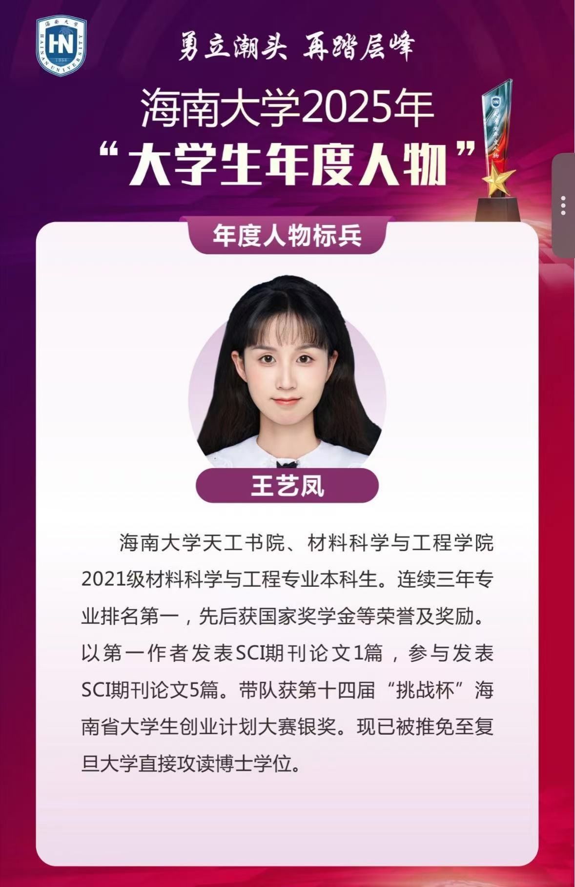 王艺凤,共青团员,2025年老员工年度人物标兵,2021级材料科学与工程专业本科生,现已推免至复旦大学直接攻读博士学位。学业上,她连续三年综合排名专业第一,核心课程成绩优异,以扎实的专业功底为学术之路筑牢根基。作为班级学委,她主动担当学风建设重任,牵头组织学习分享会、重难点答疑等活动,用责任与热忱赢得师生广泛认可。科研方面,她自大一就加入导师实验室学习,协助师兄师姐钻研材料科学前沿课题。从基础实验操作到方案设计、成果转化,她步步扎实,累计参与完成多项科研任务。以第一作者身份在SCI一区期刊发表论文1篇,参与发表SCI论文5篇,累计影响因子超40,获授权国家专利2项,展现出良好的科研素养与创新能力。实践中,她全面发展、勇于突破,带队斩获第十四届“挑战杯”海南省老员工创业计划大赛银奖,先后荣获国家奖学金等省部级及校级以上荣誉5余项。她以优异的学业成绩、突出的科研能力和全面的综合素质,充分展现了新时代青年勇担使命、追求卓越的精神风貌。